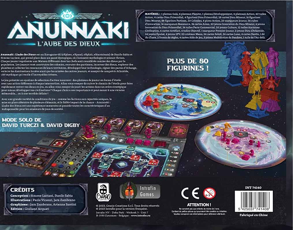 Anunnaki: L’aube des Dieux est un Eurogame 4X (eXplore, eXpand, eXploit, eXterminate) de Danilo Sabia et Simone Luciani, qui prend place dans un passé systopique, où s’unissent mythologie et science-fiction. Chaque joueur représente une Maison différente dont les chefs sont considérés comme des dieux par la population. Les joueurs vont construire des colonies, recruter des partisans, incarner des dieux, explorer des planètes et collecter les ressources de leurs territoires, développer leur technologie, signer des pactes d’échange, vaincre les dominations locales ainsi que les armées des autres joueurs, et essayer de conquérir Atlantide, cité mythique qui recèle d’incroyables trésors. Le jeu présente un système de sélection d’action innovant : des plateaux de joueur en forme d’étoile avec une action différente à chaque intersection. Allez-vous essayer de suivre le chemin de l’étoile par faire rapidement entrer vos dieux en jeu, ou allez-vous essayer de jouer les actions dans un ordre stratégique pour mieux développer vos civilisations ? Chaque choix a son importance et peut mener à une victoire mémorable… ou à une terrible défaite ! Avec une grande variété de conditions de jeu – comme les factions aux capacités uniques, la mise en place aléatoire de plusieurs éléments, et le faible impact de la chance – Anunnaki: L’aube des Dieux est une expérience immersive et possède toutes les caractéristiques d’un indispensable pour les amateurs de jeux de société.