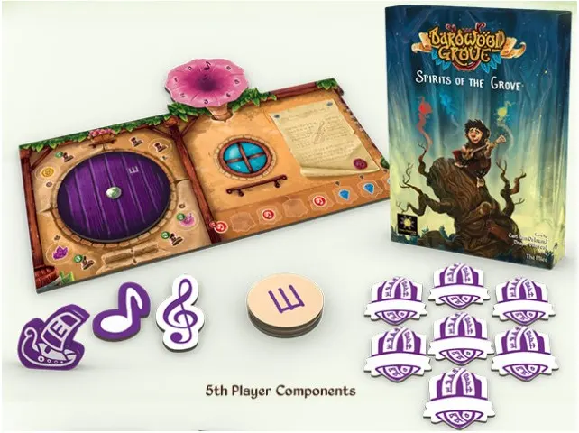 Un 5e joueur débarque au Royaume des Halfelins ! Le retour de la diversité musicale à Bardwood Grove a réveillé les esprits artistiques qui y sommeillaient. Des esprits fous de joie virevoltent et s’illuminent à présent dans la cité, désireux d’offrir leur aide aux musiciens débutants comme confirmés. Au début de la partie, chaque barde obtient le soutien de trois esprits puissants. À certains moments de la partie, ils peuvent les invoquer pour gagner des avantages puissants et immédiats. Avec l’aide des esprits, une nouvelle ère musicale commence à Bardwood Grove. Cette extension contient également le matériel nécessaire pour un 5ème joueur, ainsi que deux nouveaux bardes et huit nouveaux évènements. Nécessite le jeu de base Bardwood Grove.