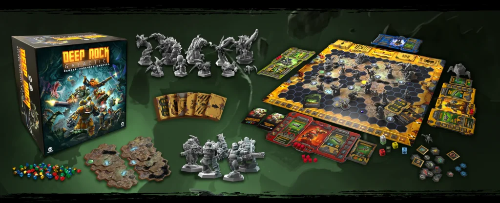 1 game board, 14 engraved dice, 129 linen cards, 116 tokens, 45 minerals, 1 swarm threat marker, 40 health and damage tokens, 1 rulebook, 1 mission book, 43 cave segments, exits, pits, drop pod, 4 double-layered player boards, 4 special miniatures, 4 unique dwarf miniatures, 38 glyphid miniatures, 7 stalagmite miniatures.