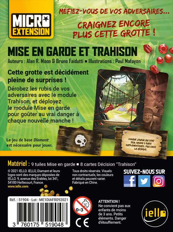 Cette grotte est décidément pleine de surprises ! Dérobez les rubis de vos adversaire avec le module trahison et déployez le module Mise en garde pour gouter au vrai danger à chaque nouvelle manche ! • 2 nouveaux modules dans une toute petite boite ! • La Mise en garde, chamboulera chacune de vos expéditions • Dérobez des rubis aux autres joueurs si ils décident de s’échapper Le jeu de base Diamant est nécessaire pour jouer.
