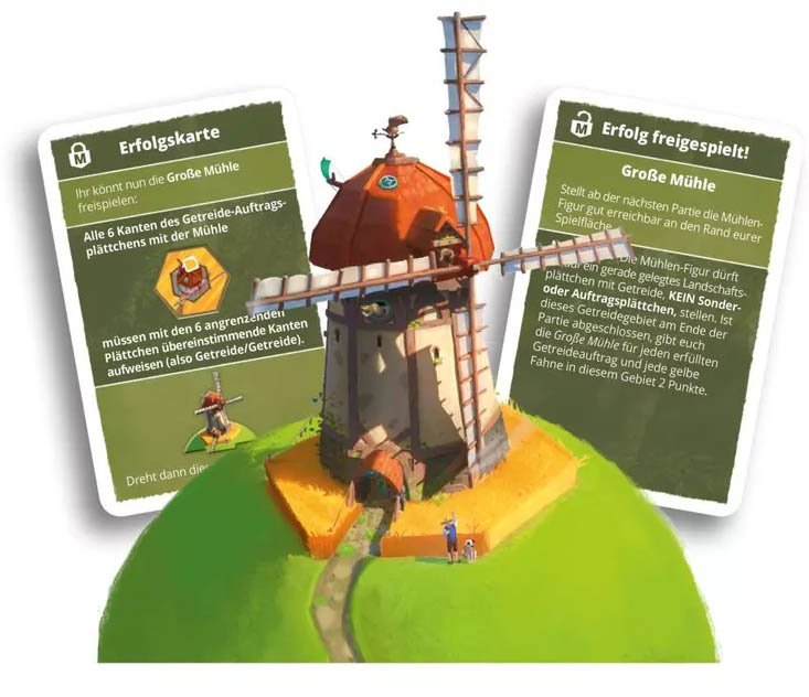 The Great Mill is a mini expansion for Dorfromantik: The Board Game and contains two cards and a mill standee. Unlocking the Mill achievement lets you score additional points for Grain Tasks and Yellow Flags by cleverly placing the mill piece.