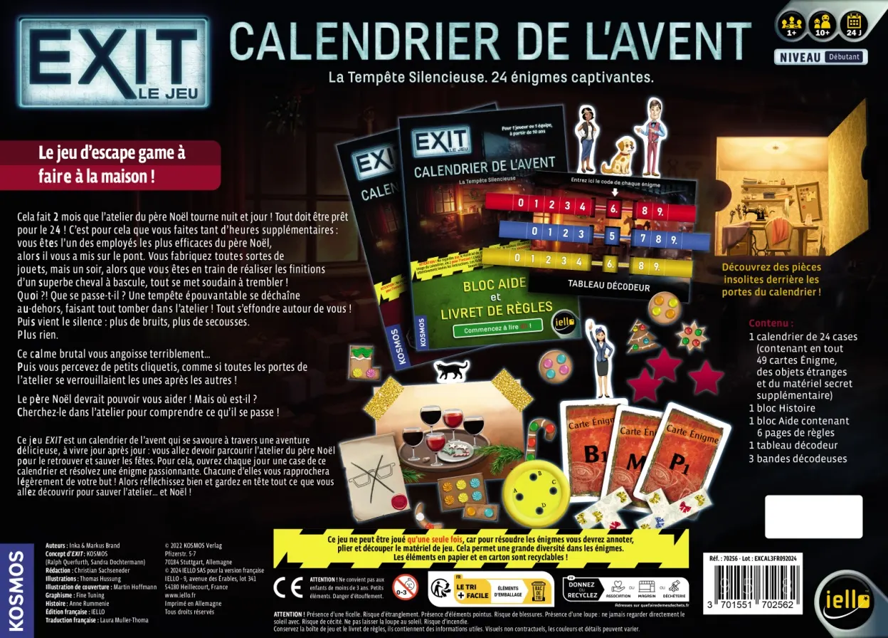 EXIT est un jeu qui reprend les sensations des « Escape games ». Muni d’indices, de matériel et d’un décodeur, vous aurez pour mission de sortir du jeu le plus rapidement possible. Votre plateau est le calendrier de l’avent lui-même. Il est complété par le bloc Histoire. Vous y apprendrez exactement ce qui arrive à votre personnage, et trouverez chaque jour un nouveau chapitre pour avancer dans l’histoire. • Une expérience immersive d’un mois pour attendre Noël • Un jeu coopératif où réflexion, observation et logique sont primordiales • Une expérience de jeu unique, surprenante et inoubliable • Taille de la boîte : 45 x 33 x 5cm.