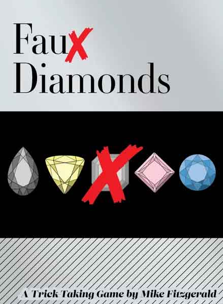 Faux Diamonds is a 4-suit trick-taking game in which players sell their cards (diamonds) on value tracks that change after each sale. After a series of hands, the winner is the player who has accumulated the most wealth.