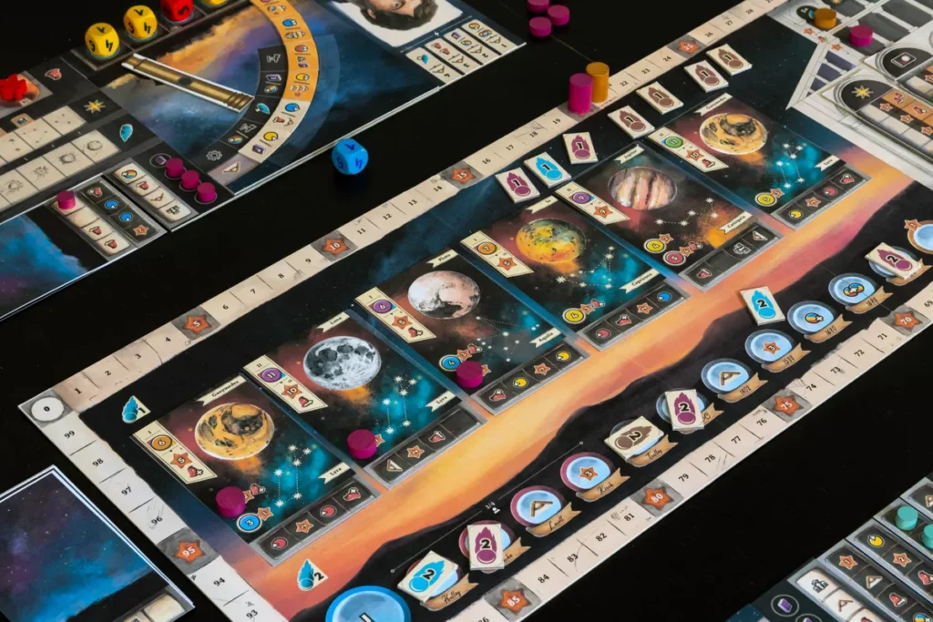 Use your telescope to select one of the five actions available, with you being able to evolve these actions into better ones. Collect cards of different planets and star systems. Collect lenses of the three main colors to make a discovery. Be wary of inquisitors as they might arrive unwelcomed and ruin your fame in no time. Better find a way to profit from their visit instead.