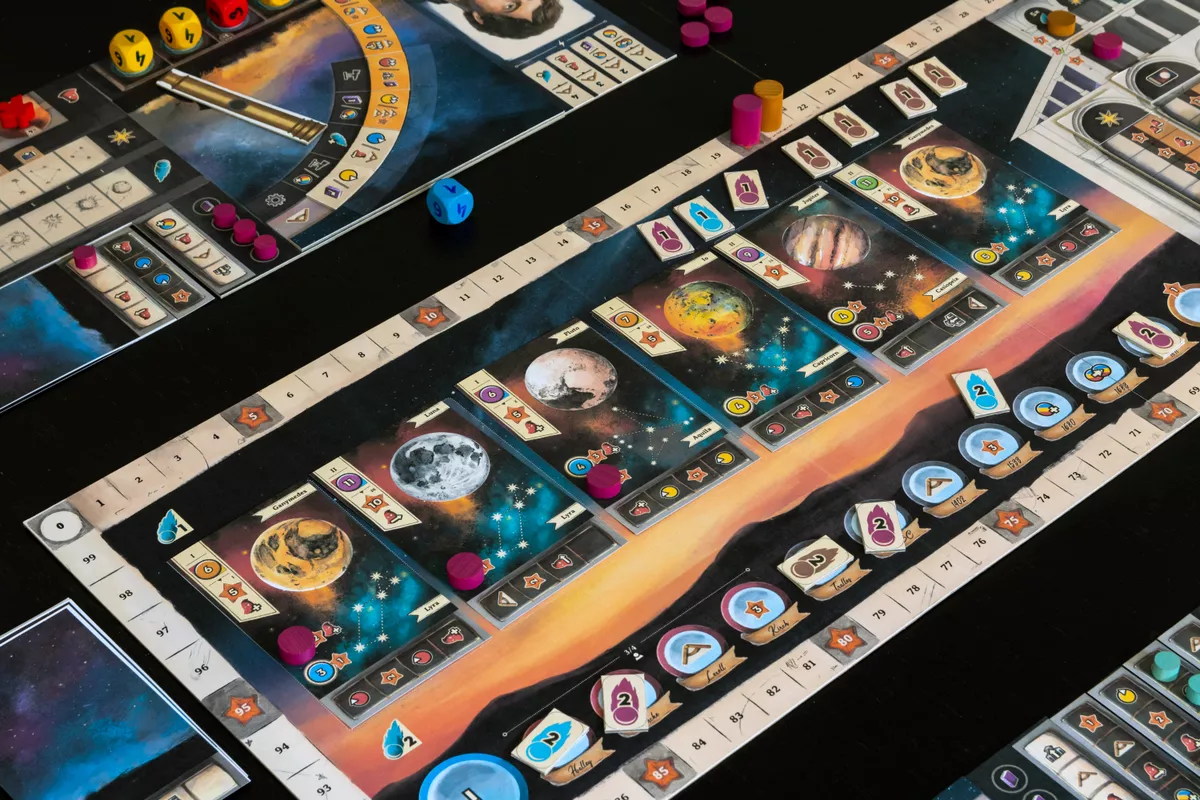 Galileo Galilei is a Euro-style game in which you take on the role of an astronomer who will discover new planets, find unknown star systems, develop their telescope, and make a scientific breakthrough in the difficult ages of obscurantism.