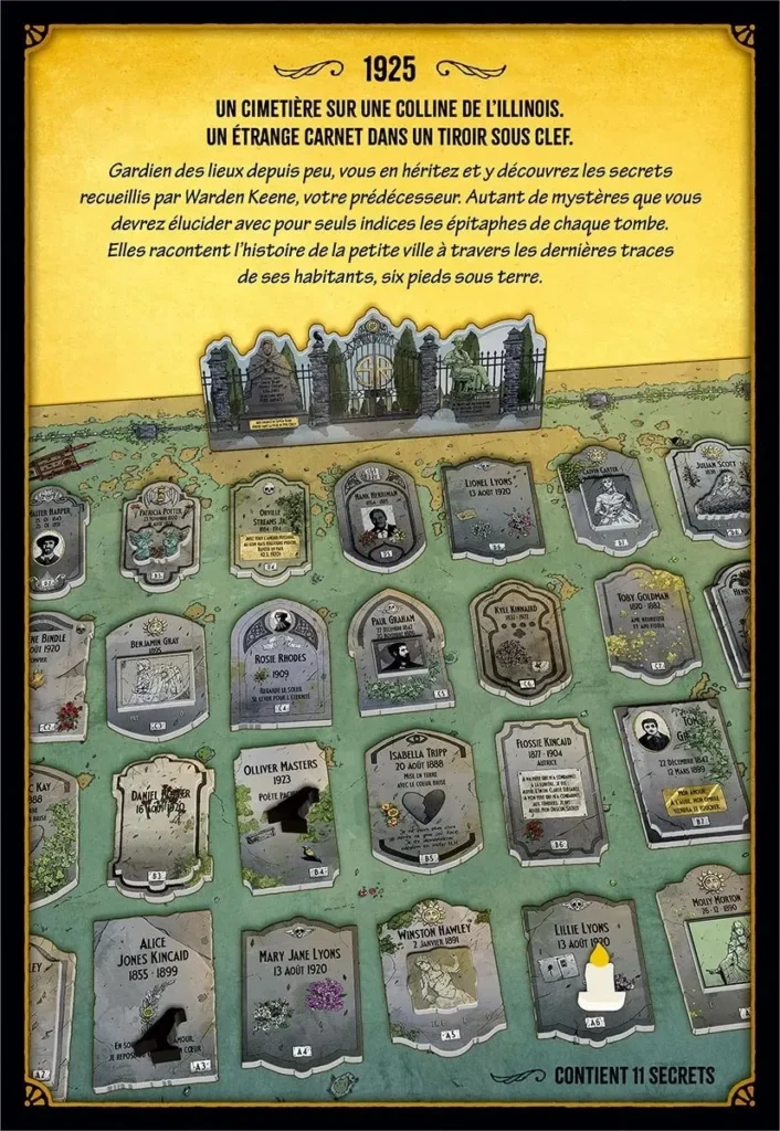 Les Secrets de Warden Keene: résolvez les énigmes du cimetière de Spoon River, comme l’a fait le directeur Keene avant vous ! 1925. Un cimetière sur une colline de l’Illinois. Ensemble, résolvez les 11 mystères des anciens habitants grâce aux épitaphes inscrites sur leurs stèles. Pas de points ni de victoire. Laissez-vous juste porter par le plaisir d’élucider des énigmes et de découvrir leur vie passée. Et si vous êtes bloqués, lisez le raisonnement ligne par ligne jusqu’à l’élément qu’il vous manquait. Grâce à vos sens de l’observation et de la déduction, vous allez découvrir les secrets soigneusement consignés dans son carnet par l’ancien gardien du cimetière que vous remplacez. Car les mots ont un sens, il le savait bien. Si vous êtes malin et observateur, ses notes, ainsi que les épitaphes et les dates sur les stèles du petit cimetière de Spoon River, prendront tout leur sens. Ne vous précipitez pas. Aidez-vous des raisonnements de Warden Keene si besoin, et vous comprendrez que ces tombes ne sont pas si muettes que cela…