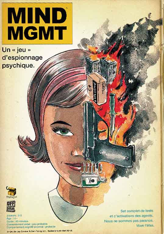 Dans Mind MGMT : The Psychic Espionage « Game », un joueur contrôle Mind MGMT et doit parcourir la ville à la recherche de nouvelles recrues. Ils se déplacent sur une carte secrète, en essayant de visiter des lieux qui correspondent à l’une de leurs trois cartes de caractéristiques tirées au hasard. Il peut également utiliser ses quatre Immortels pour protéger les lieux contre les attaques.