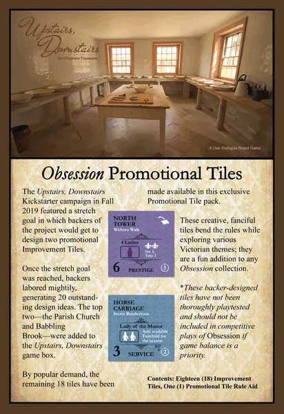 Découvrez ce pack de 18 tuiles promotionnelles pour le jeu Obsession de Kayenta Games. Ces tuiles d’amélioration couvrent les cinq catégories de tuiles : sept tuiles SERVICE, deux ESTATE, deux ESSENTIALS, trois PRESTIGE, une SPORTING, et trois tuiles SPECIALISEES (une hybride, une joker et une tuile prototype). Cherchez des comètes dans un observatoire de jardin, tentez de lancer une montgolfière sur la pelouse de l’Est, améliorez votre personnel de service d’innombrables façons, ou soyez tout ce que vous voulez être dans la galerie d’art ! Toutes les tuiles sont thématiques et correspondent à l’époque victorienne.
