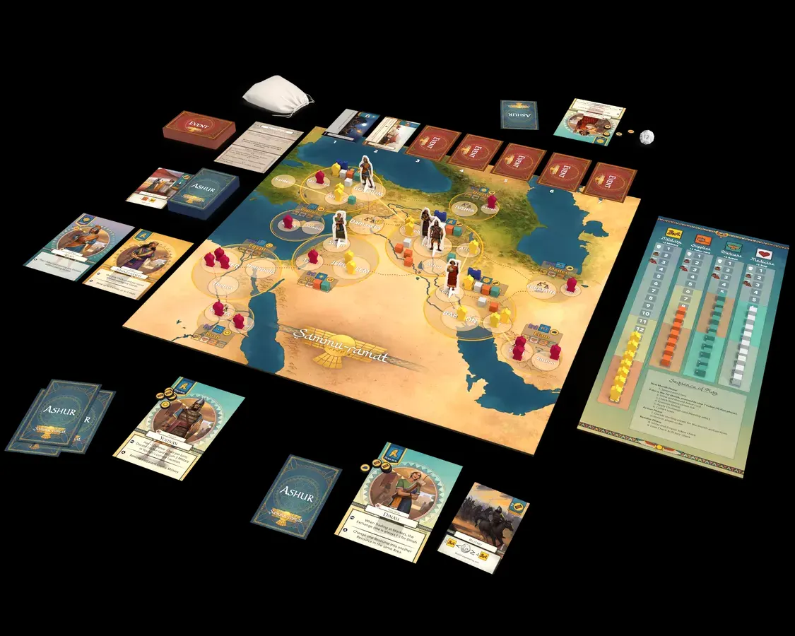 Sammu-ramat ruled the Assyrian Empire at a time of political uncertainty, which is one of the possible explanations for why Assyrians may have accepted her rule (as normally a woman as ruler would have been unthinkable). Her reign lasted between 811 BC – 808 BC. In this collaborative game you the players are Sammu-ramat, together with advisors surrounding the royal court and vassal states, you try to keep the Empire strong and protected against internal unrest, external threats, natural disasters and much more. All players win or lose together.