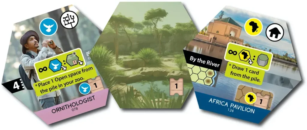 Chaque joueur dispose de quatre cartes d’action pour gérer son jeu, et la puissance d’une action dépend de l’emplacement qu’occupe la carte à un moment donné. L’une de ces cartes vous permet de jouer des projets, tandis que les trois autres vous permettent d’ajouter des animaux selon leur habitat : forêt, roche ou eau.