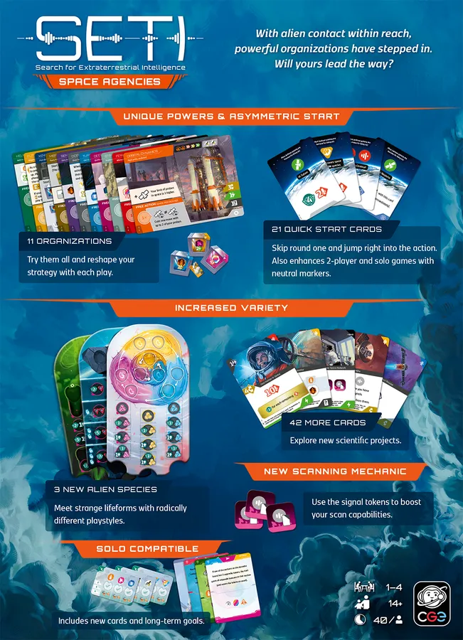 SETI : Recherche d’Intelligence Extraterrestre – Agences Spatiales une extension pour SETI : Recherche d’Intelligence Extraterrestre ! En tant que dirigeant de l’une de ces institutions – allant d’entreprises technologiques privées à des réseaux de recherche mondiaux – vous apporterez une perspective distincte et des outils spécialisés à la mission, débloquant de nouvelles stratégies audacieuses et récompensant la planification à long terme. En plus de ces organisations, l’extension ajoute trois nouvelles espèces extraterrestres, chacune avec ses particularités, et plus de quarante nouvelles cartes de projet inspirées d’initiatives du monde réel. Ces cartes s’intègrent parfaitement au jeu principal, offrant encore plus de variété et d’options stratégiques. Les cartes départ rapide, conçues pour être utilisées avec les organisations, vous permettent de sauter le lent tour d’ouverture et de plonger directement dans l’action. Elles introduisent une couche supplémentaire d’asymétrie lors de la mise en place et peuvent être utilisées pour accélérer les parties lorsque le nombre de joueurs est faible. Enfin, l’extension introduit les jetons de signal, un nouveau mécanisme subtil mais significatif qui améliore l’efficacité de la numérisation. Que vous vous adaptiez aux forces de votre organisation ou que vous releviez de nouveaux défis interstellaires, SETI : Recherche d’Intelligence Extraterrestre – Agences Spatiales approfondit le paysage stratégique de votre mission de découverte de la vie au-delà de la Terre. • 40 nouvelles cartes Projet • De nouvelles stratégies grâce aux nouveaux jetons • 3 nouvelles races extraterrestres