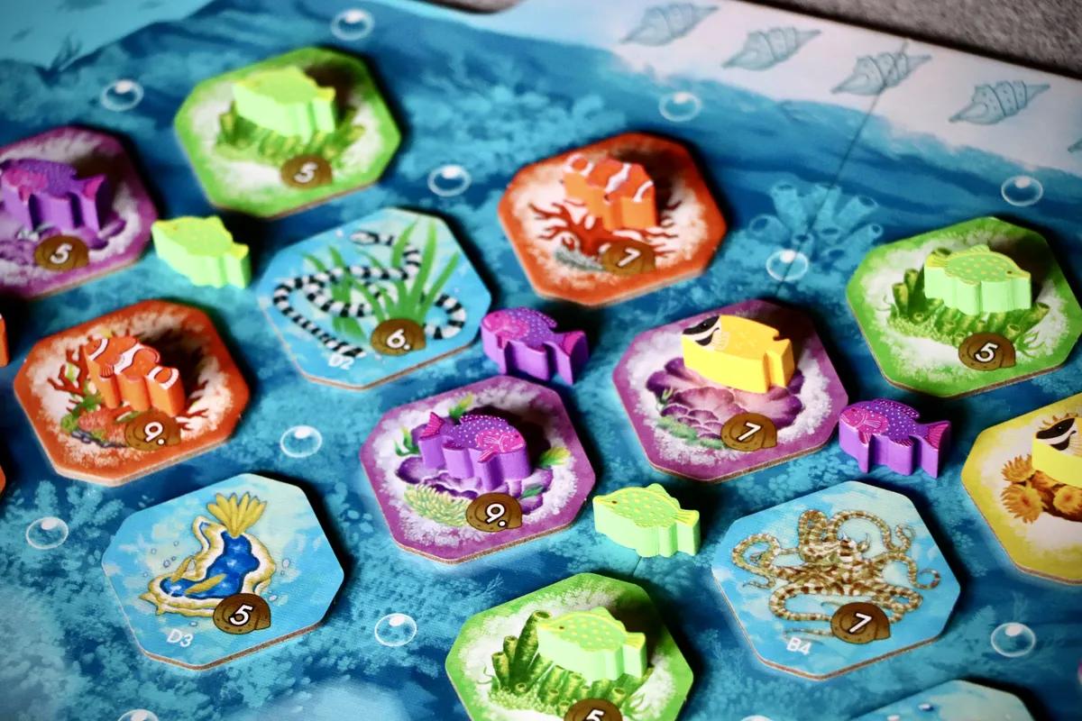 On your turn, choose tiles showing fish, coral, or sea life, and place them on an empty space on your board. When fish surround a coral of the same color, you flip over the completed coral, which becomes a home for fish. Choose which fish will inhabit the coral, keeping the puzzle and ecosystem cards in mind. Use seashells to lure fish and move them, ideally completing multiple coral at once if you build them strategically.