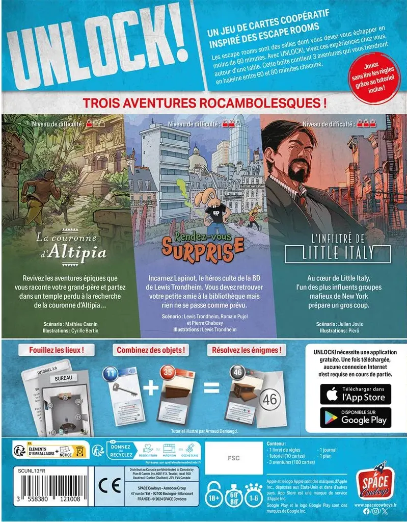 L’application gratuite Unlock!, compatible avec les téléphones et tablettes Android et iOS, est nécessaire pour jouer. Elle permet d’obtenir des indices, de repérer des objets cachés, mais aussi d’entrer les codes découverts. Elle contribue également à l’ambiance avec ses musiques dédiées à chaque aventure, ses énigmes audio, ses terribles pénalités et son compte à rebours fatal !