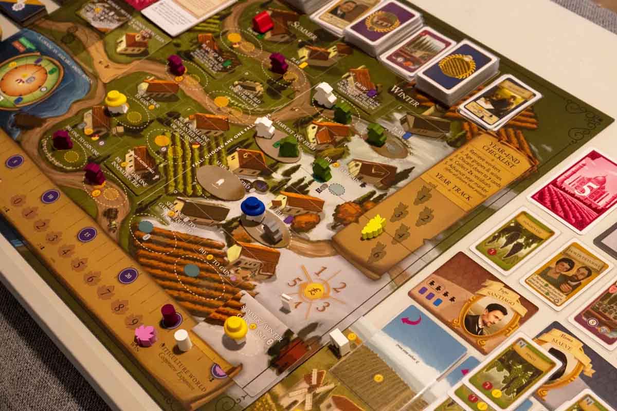 Using the new game board, tiles, tokens, and event cards combined with the original vineyard mats and game cards, you have six years to achieve the two conditions necessary for victory in the selected region: (1) Each player must reach 25 victory points and (2) the shared influence token must reach the end of the influence track. The cooperation, objectives, and asymmetry in this expansion are similar to that of Spirit Island and Orleans: Invasion.